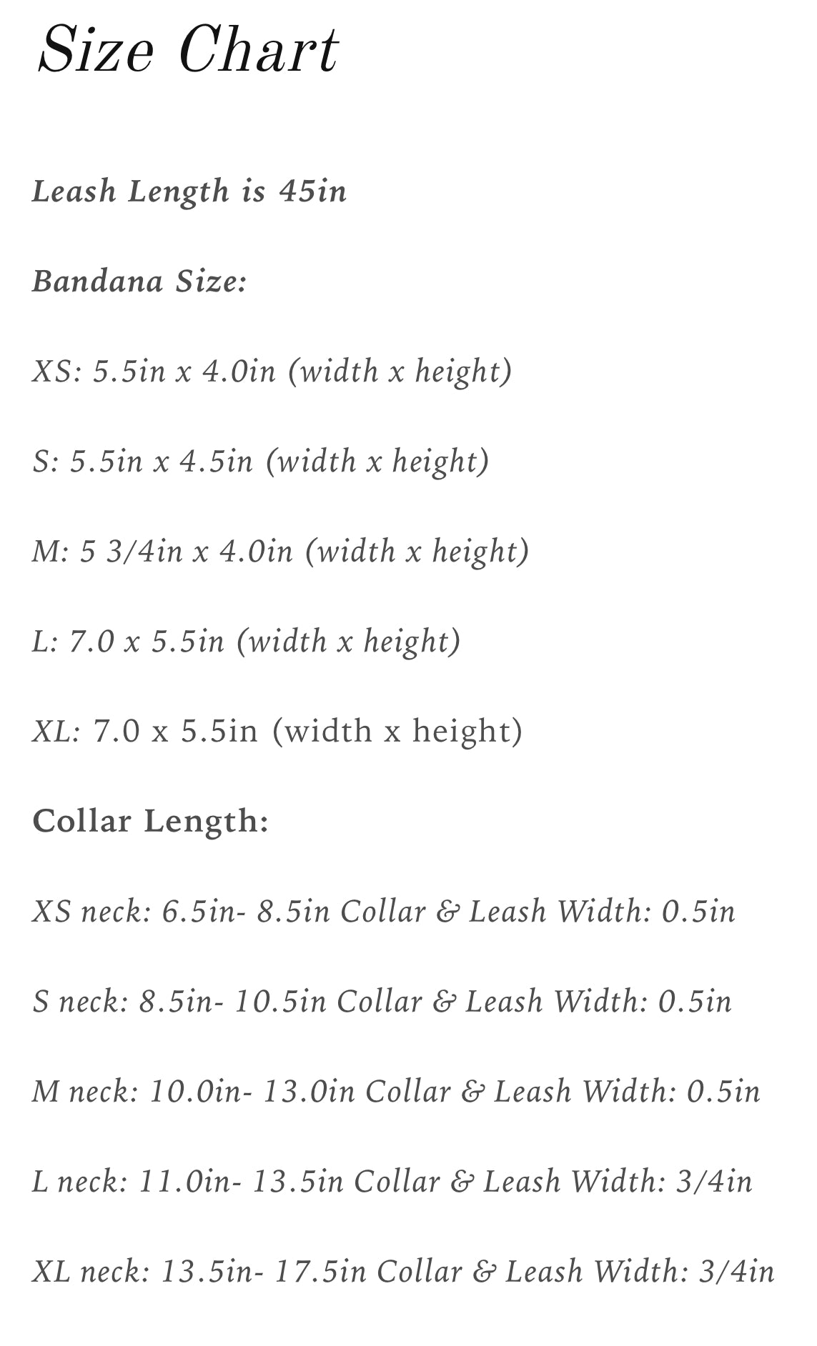 L neck: 11.0in- 13.5in Collar & Leash Width: 3/4in