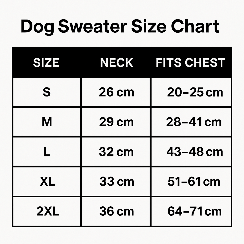 *PLEASE NOTE: These sweaters are sized differently than our dog tees. Be sure to check your pet's measurements before ordering. If you are in between sizes, order the larger size