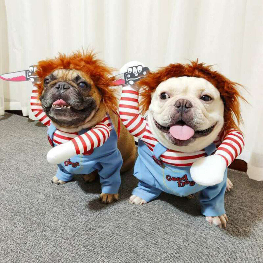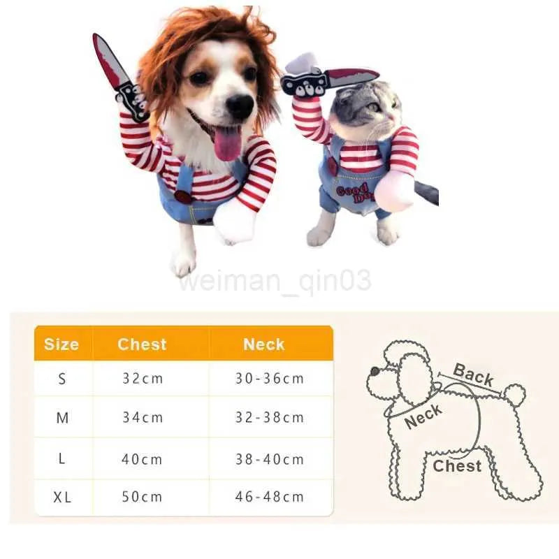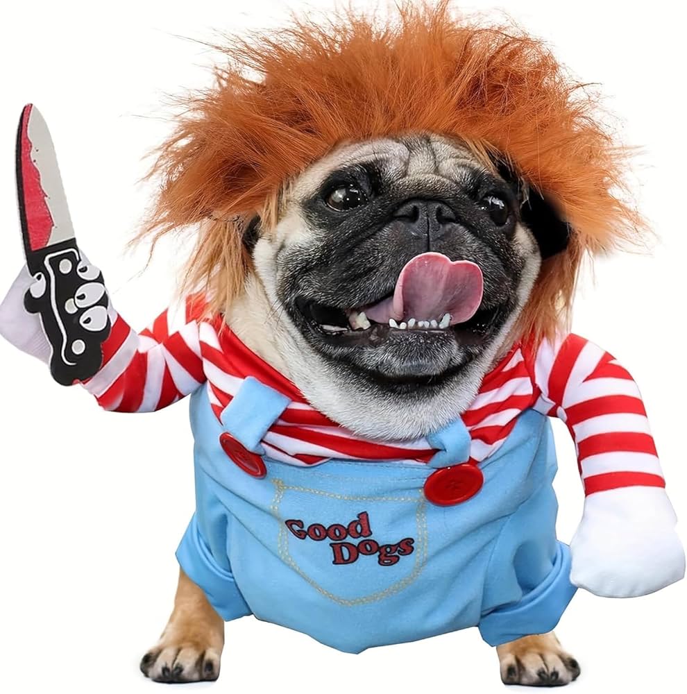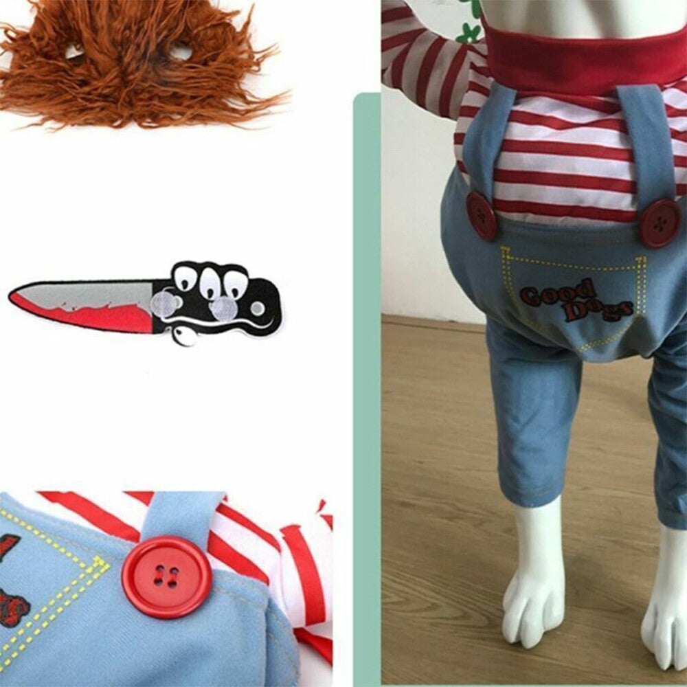 Bring spooky fun to your Halloween with this hilarious pet costume! Inspired by the iconic doll from a famous horror movie, this outfit will definitely get laughs (and a few chills).