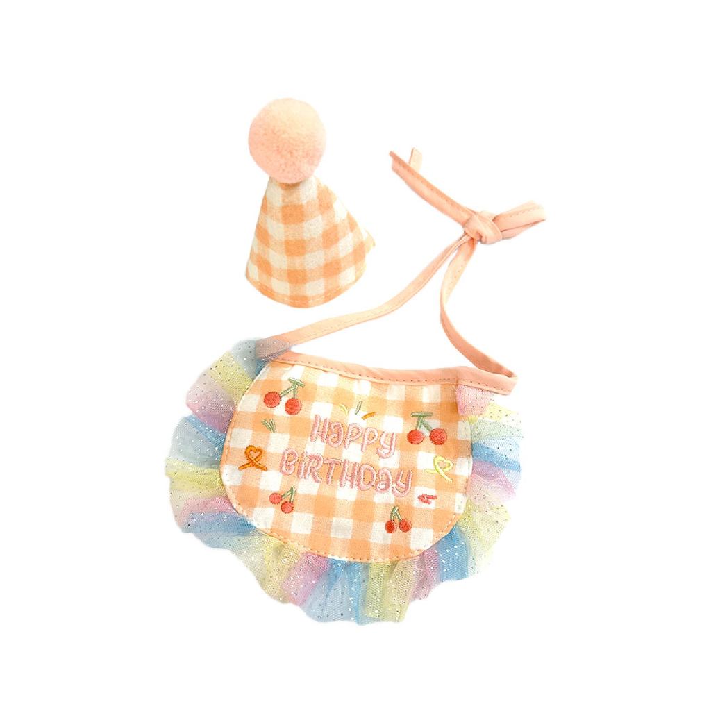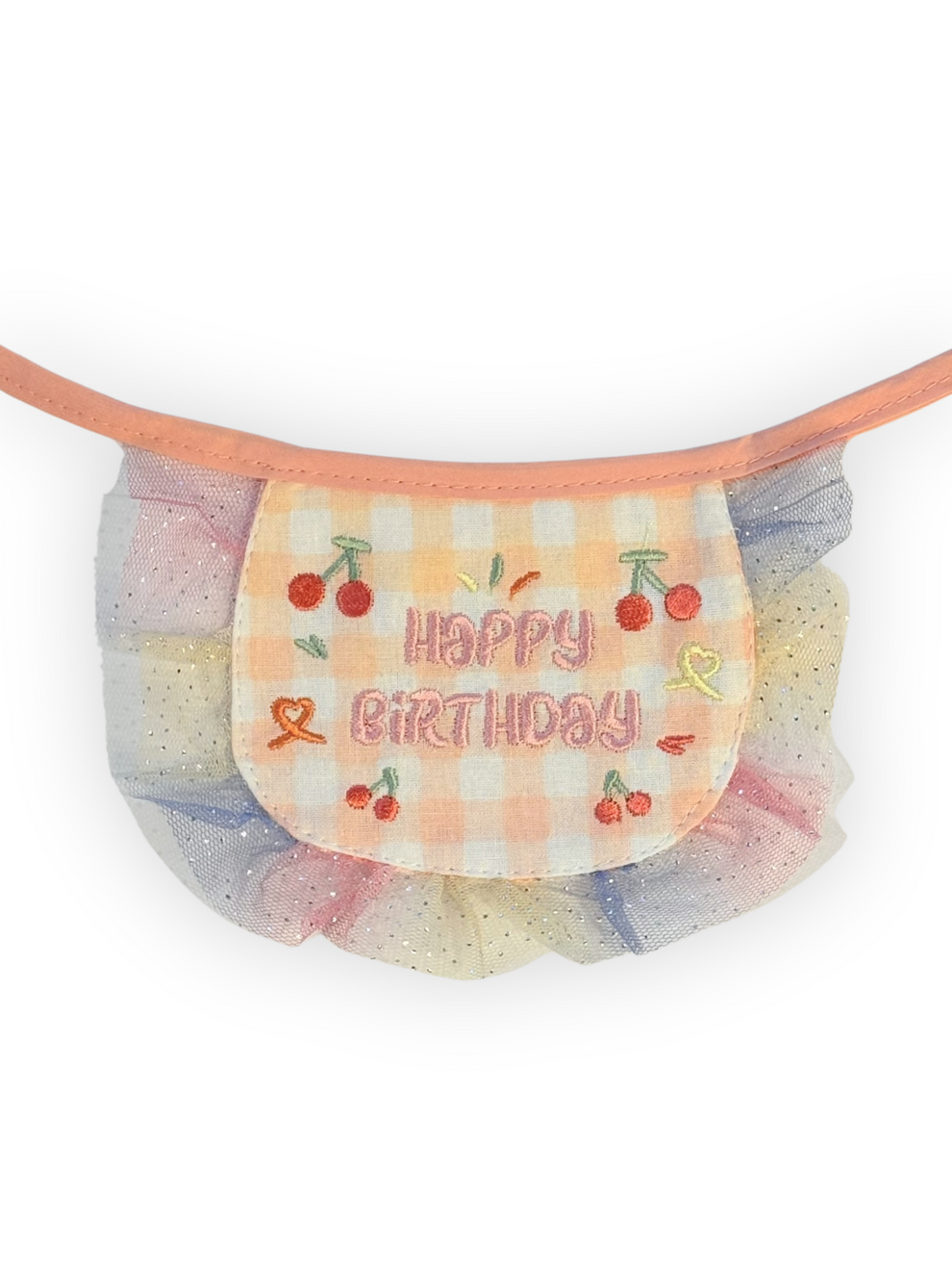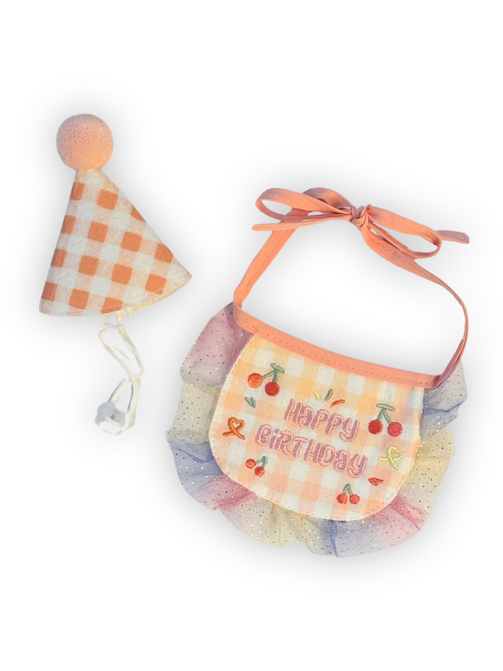 Celebrate your pup’s big day in the sweetest way with our Happy Birthday Bib & Hat Set! This cheerful duo includes a gingham bib embroidered with “Happy Birthday” and cherry accents, finished with a colorful lace trim. The matching party hat features the same gingham print and a playful puff ball on top for the perfect birthday photo moment. Whether it's their first barkday or their fifth, this set brings the party vibes!